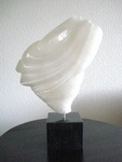 2005Dit sculptuur een doek van witte albast mooie plooi valling, waaid op in de wind.Doorschijnend in het licht.Door de pin 'los'' van de sokkel versterkt het 'zwevend effect.